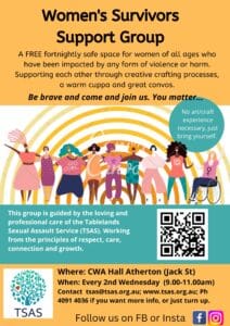 The TSAS Women’s Survivors Group is free and open to all women who have been impacted by any form of violence or harm (e.g. sexual assault, DV etc). The group meet fortnightly and enjoy a morning of art and craft, coffee, conversations and supportive companionship. The concept of communal groups and peer to peer support builds on a long tradition of women coming together to problem solve, build connections, and strengthen communities. The TSAS Women’s Survivors support group is a self-directed space, with no expectations around contribution. The group is supported by TSAS specialist practitioners. Download the flyer here