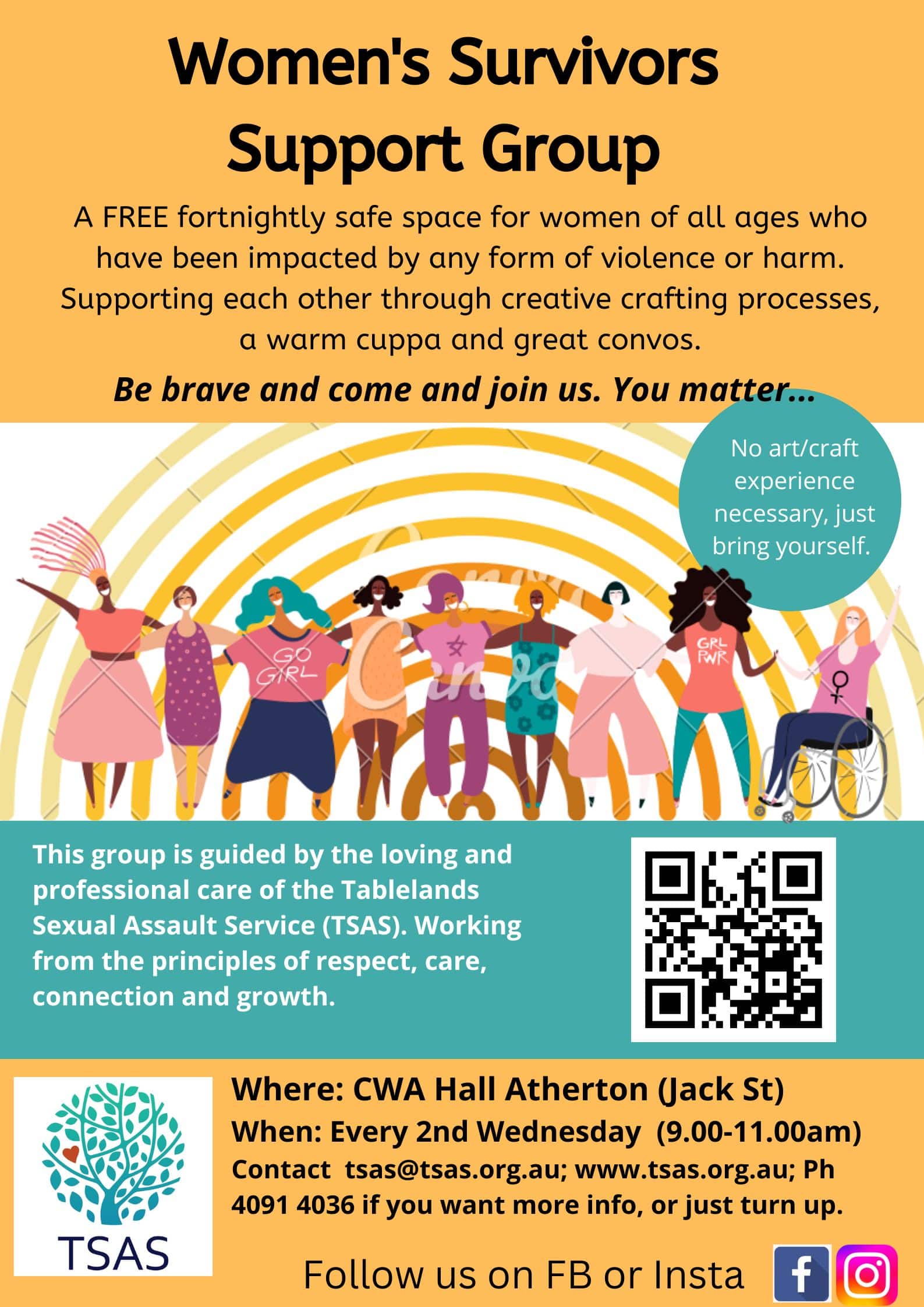 The TSAS Women’s Survivors Group is free and open to all women who have been impacted by any form of violence or harm (e.g. sexual assault, DV etc). The group meet fortnightly and enjoy a morning of art and craft, coffee, conversations and supportive companionship. The concept of communal groups and peer to peer support builds on a long tradition of women coming together to problem solve, build connections, and strengthen communities. The TSAS Women’s Survivors support group is a self-directed space, with no expectations around contribution. The group is supported by TSAS specialist practitioners. Download the flyer here